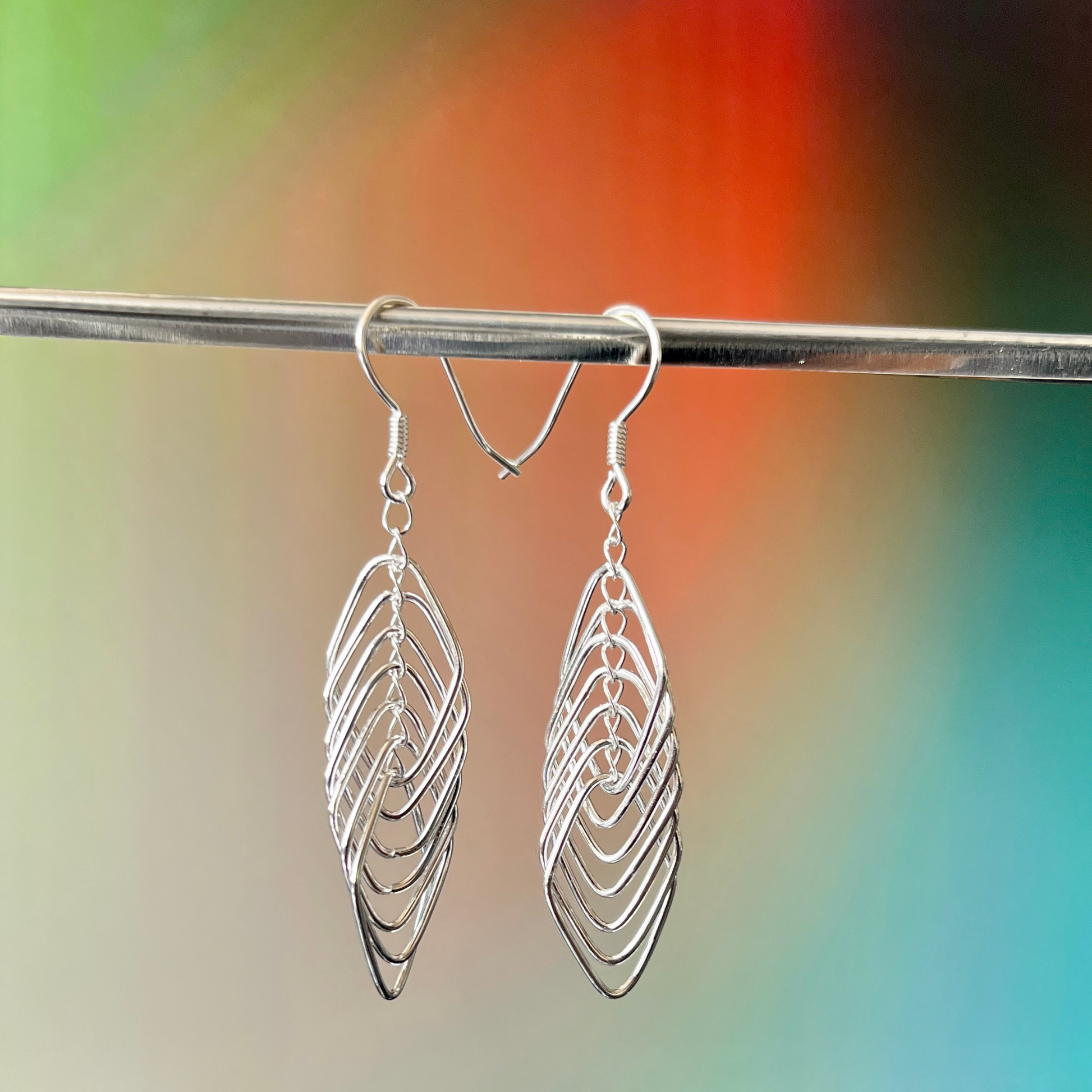 Aritos colgantes elaborados en plata italiana 925, con un diseño moderno en capas superpuestas que forman una figura geométrica alargada. Su estructura ligera y estilizada aporta movimiento y brillo, ideales para complementar tanto looks casuales como elegantes.