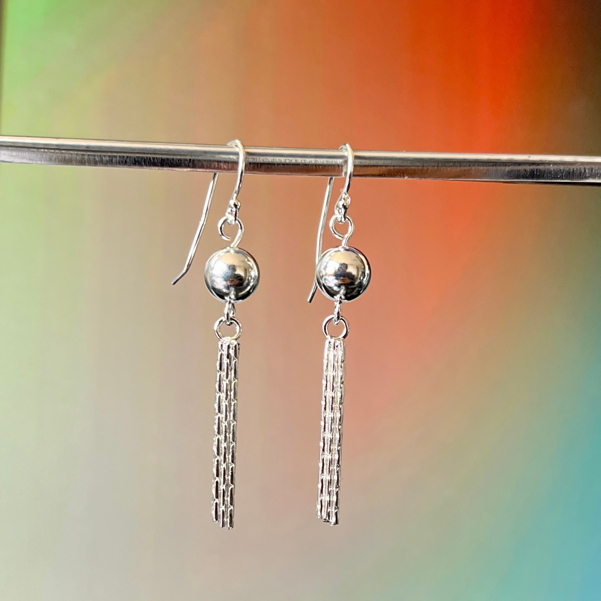 Un diseño contemporáneo que combina la pureza de una esfera pulida en plata 925 con flecos de cadenas finas. Un accesorio dinámico y elegante que añade un toque moderno a tu outfit.