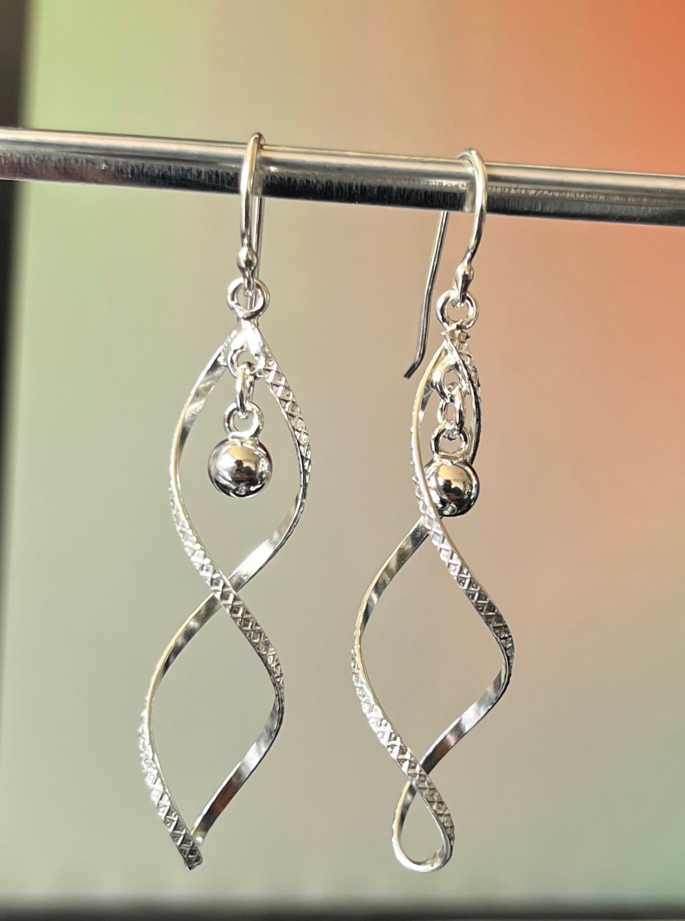 Aretes de plata italiana 925 con diseño de espiral alargada y bolita colgante en el centro, que aporta brillo y movimiento. Una pieza sofisticada y moderna que combina ligereza con un estilo elegante y atemporal.