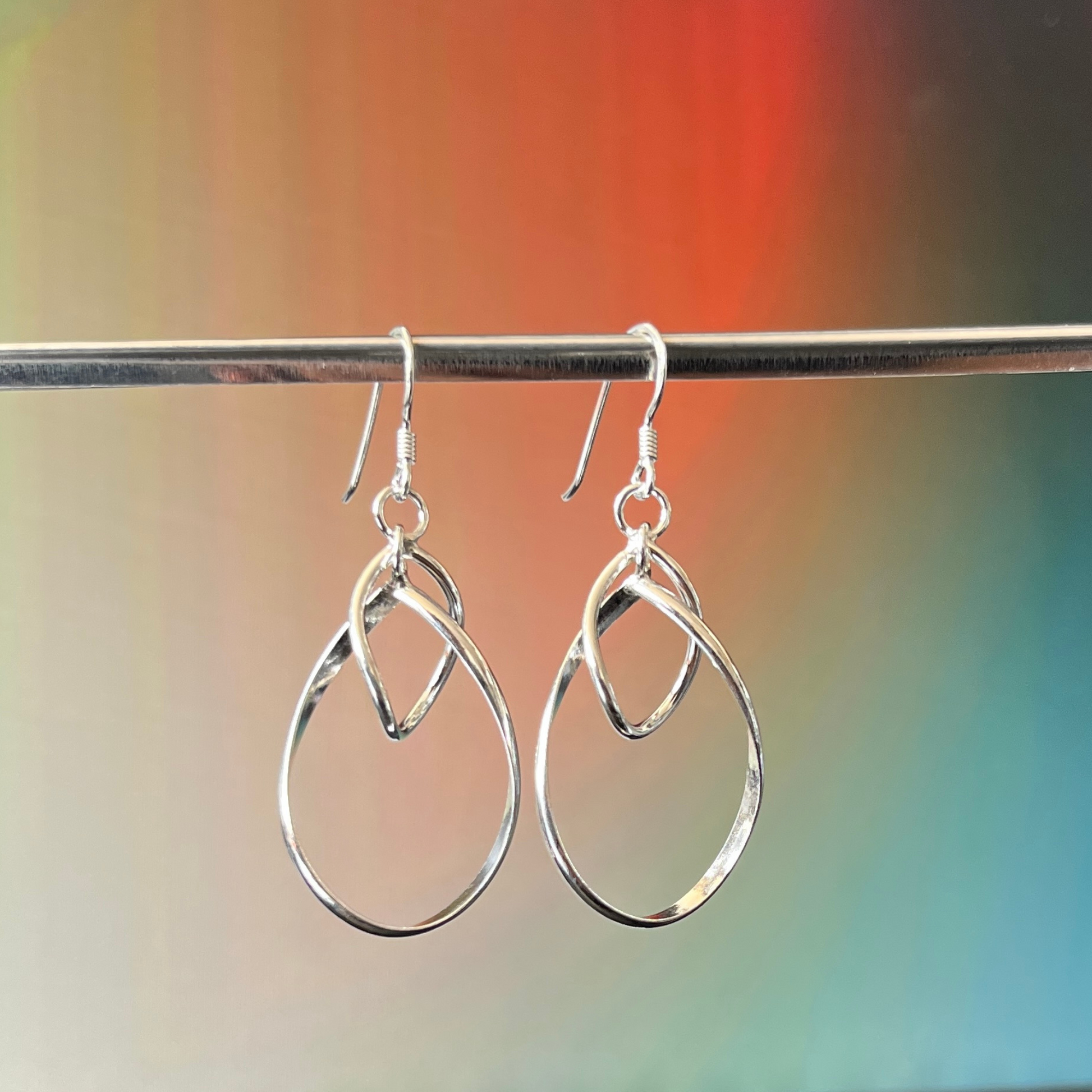 Diseño de líneas suaves en forma de gota doble entrelazada, elaborados en plata italiana 925. Un accesorio elegante que combina sencillez y modernidad, ideal para acompañar tanto outfits casuales como de fiesta.