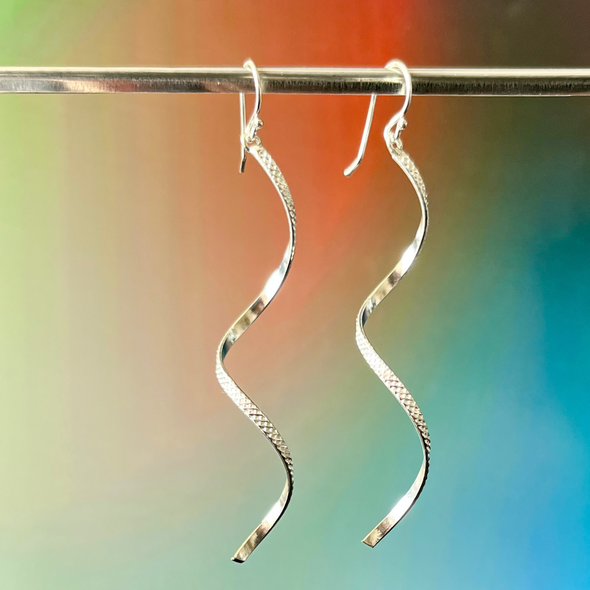 Elegantes aretes largos elaborados en plata italiana 925 con diseño ondulado en espiral que refleja la luz con cada movimiento. Su forma estilizada y moderna aporta dinamismo y sofisticación, ideales para realzar cualquier look tanto de día como de noche.