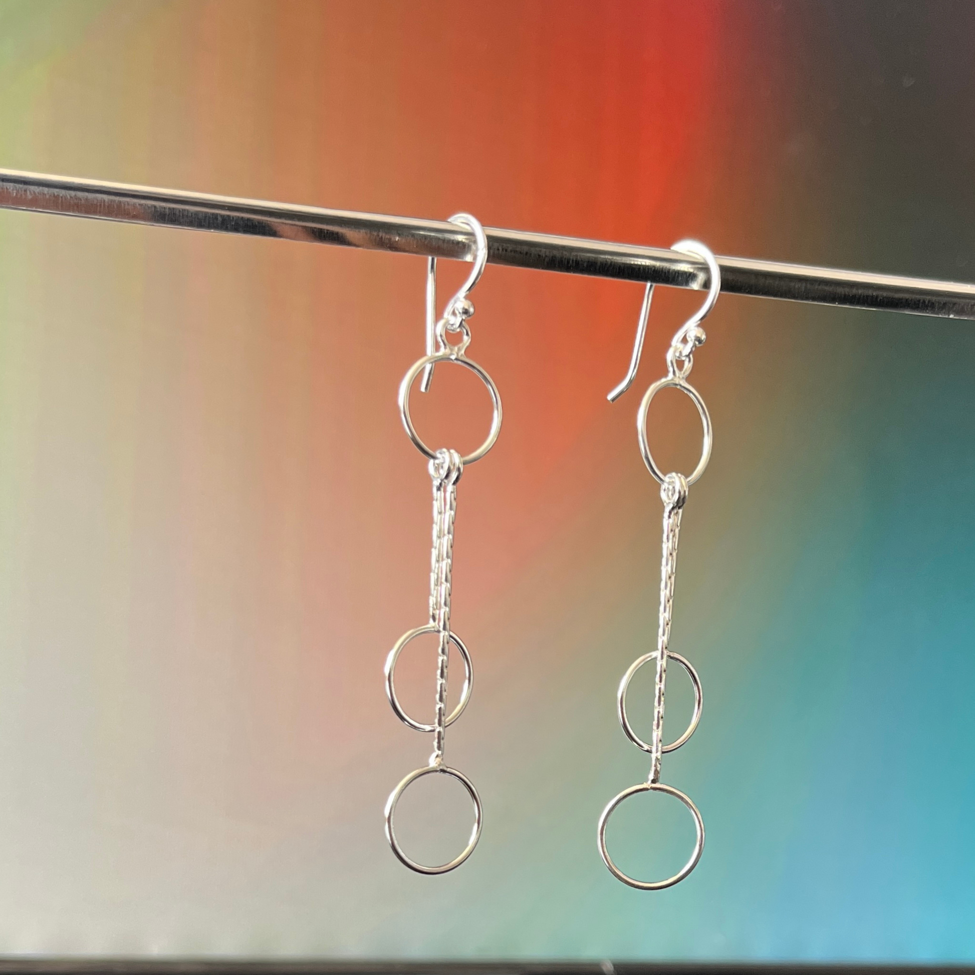 Aretes largos confeccionados en plata italiana 925 con un diseño minimalista de tres aros colgantes unidos por cadenas finas. Su estilo geométrico y moderno los convierte en una pieza versátil, ideal para complementar tanto outfits casuales como elegantes.