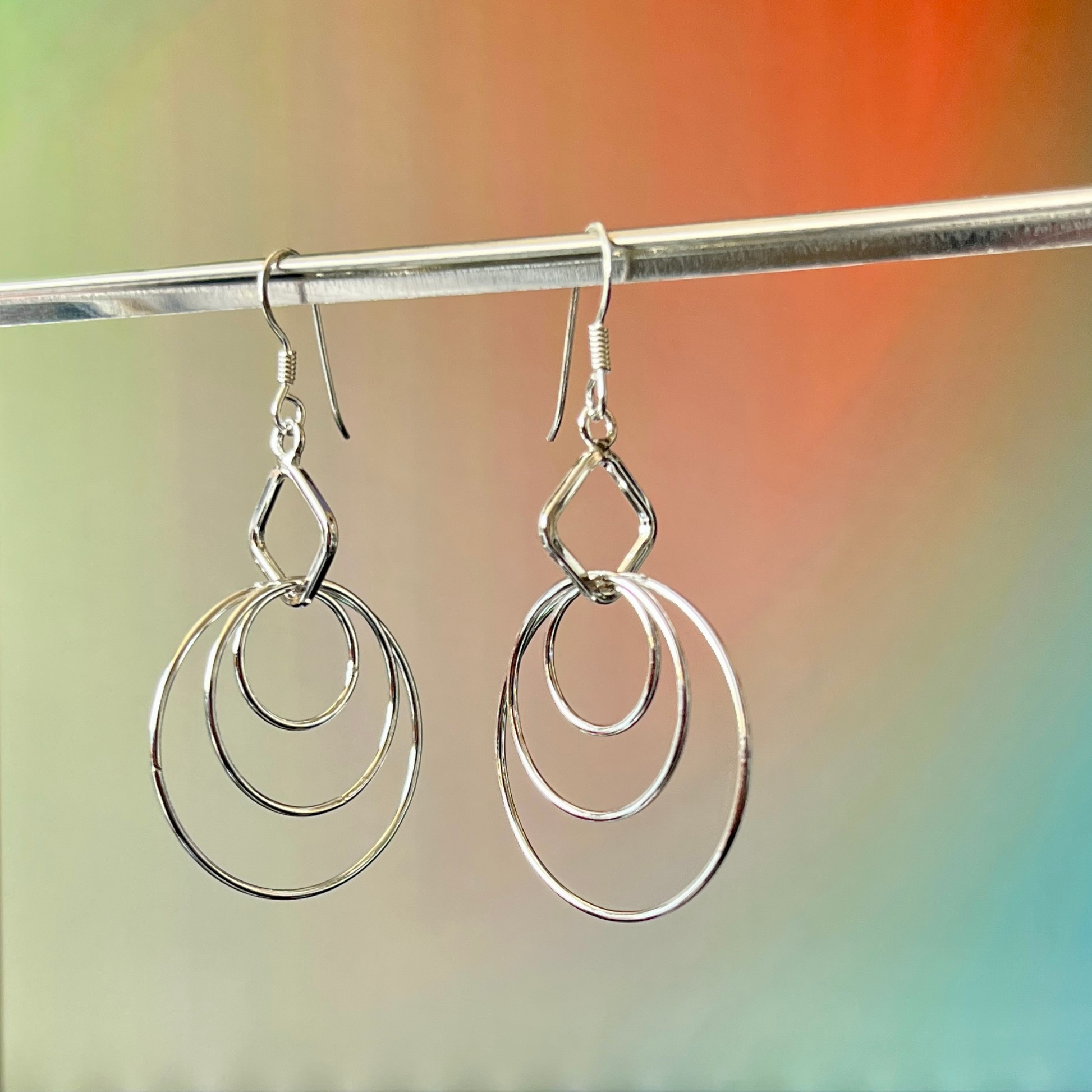 Impactantes aros colgantes en plata italiana 925 con estructura de rombo en la parte superior y tres aros concéntricos colgantes. Una joya llamativa que combina geometría y elegancia.