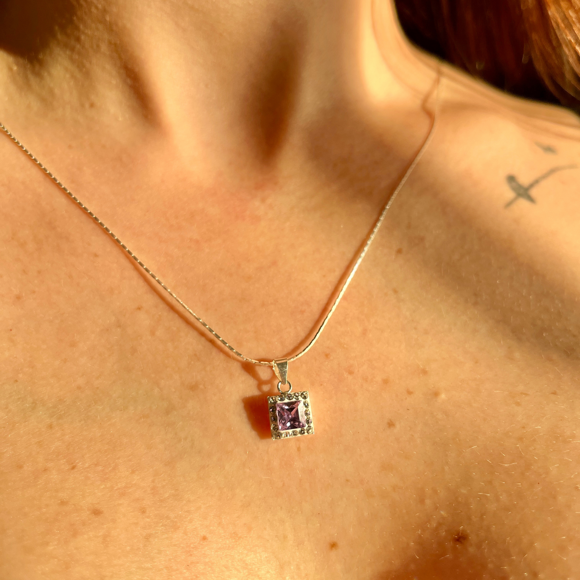 Este elegante colgante presenta un diseño cuadrado moderno con un deslumbrante circón central de corte princesa, rodeada por un marco de brillantes circonias cúbicas aportando un toque de sofisticación y espiritualidad, mientras que el engaste en tono plata realza su brillo y delicadeza. Ideal para complementar tanto looks formales como casuales.
