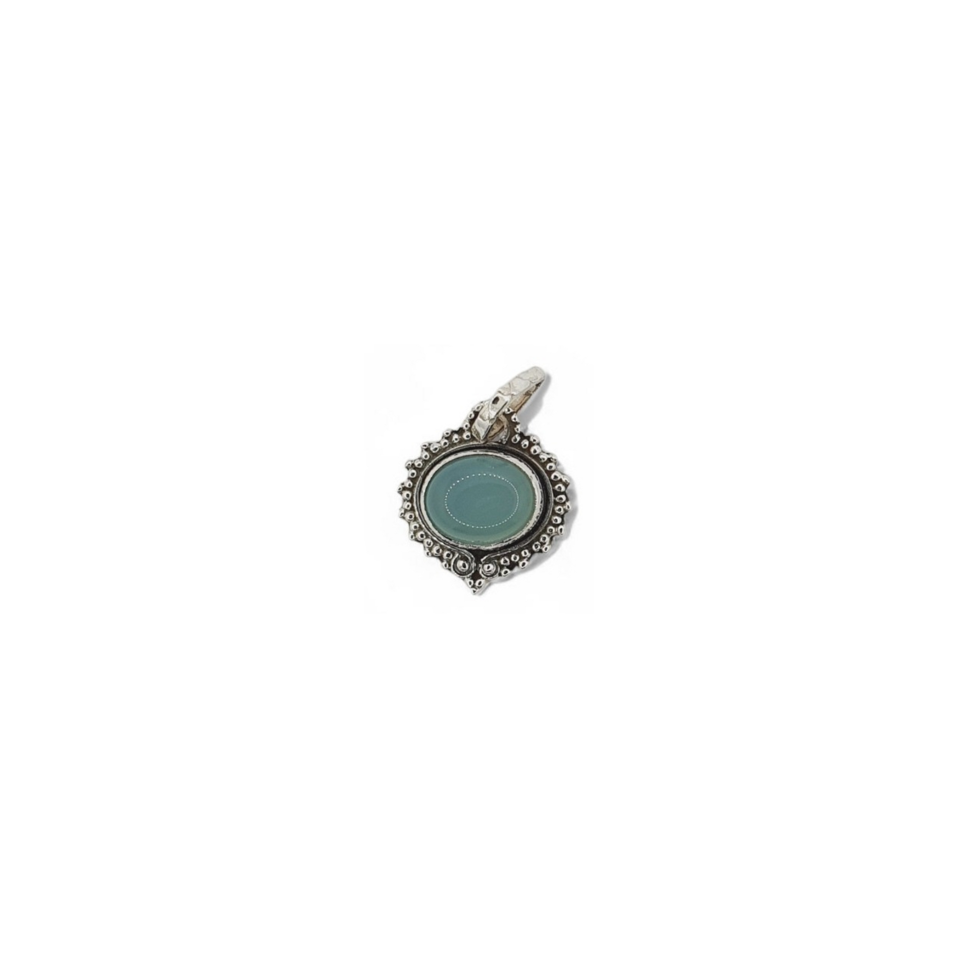 Un colgante de diseño clásico y elegante con piedra natural de calcedonia tallada en forma cuadrada. El marco de plata 925 italiana decorado con un borde de cuentas en relieve le otorga un estilo atemporal que combina perfectamente con cualquier atuendo.