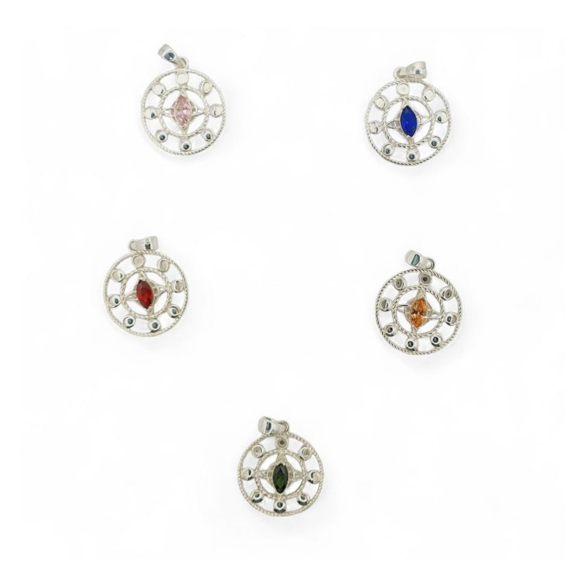 Estos hermosos dijes están elaborados en plata 925 italiana, con un diseño circular que enmarca un nudo de bruja, símbolo de protección, energía y sabiduría ancestral. En el centro resalta un brillante circon tallado en forma navette (disponible en varios colores), que aporta luz y elegancia a cada pieza.