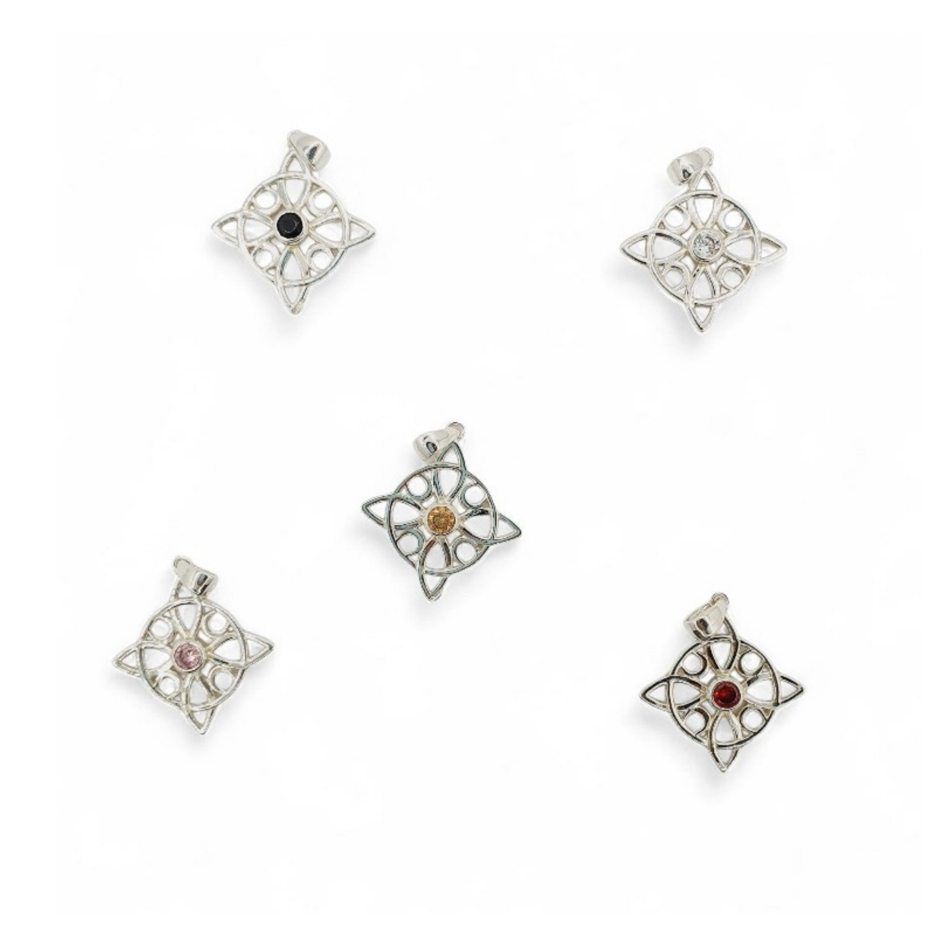 Este elegante dije está elaborado en plata 925 italiana, con un diseño de nudo de bruja que simboliza protección, energía y conexión espiritual. En el centro destaca un brillante circon de color que aporta un toque único y lleno de personalidad.