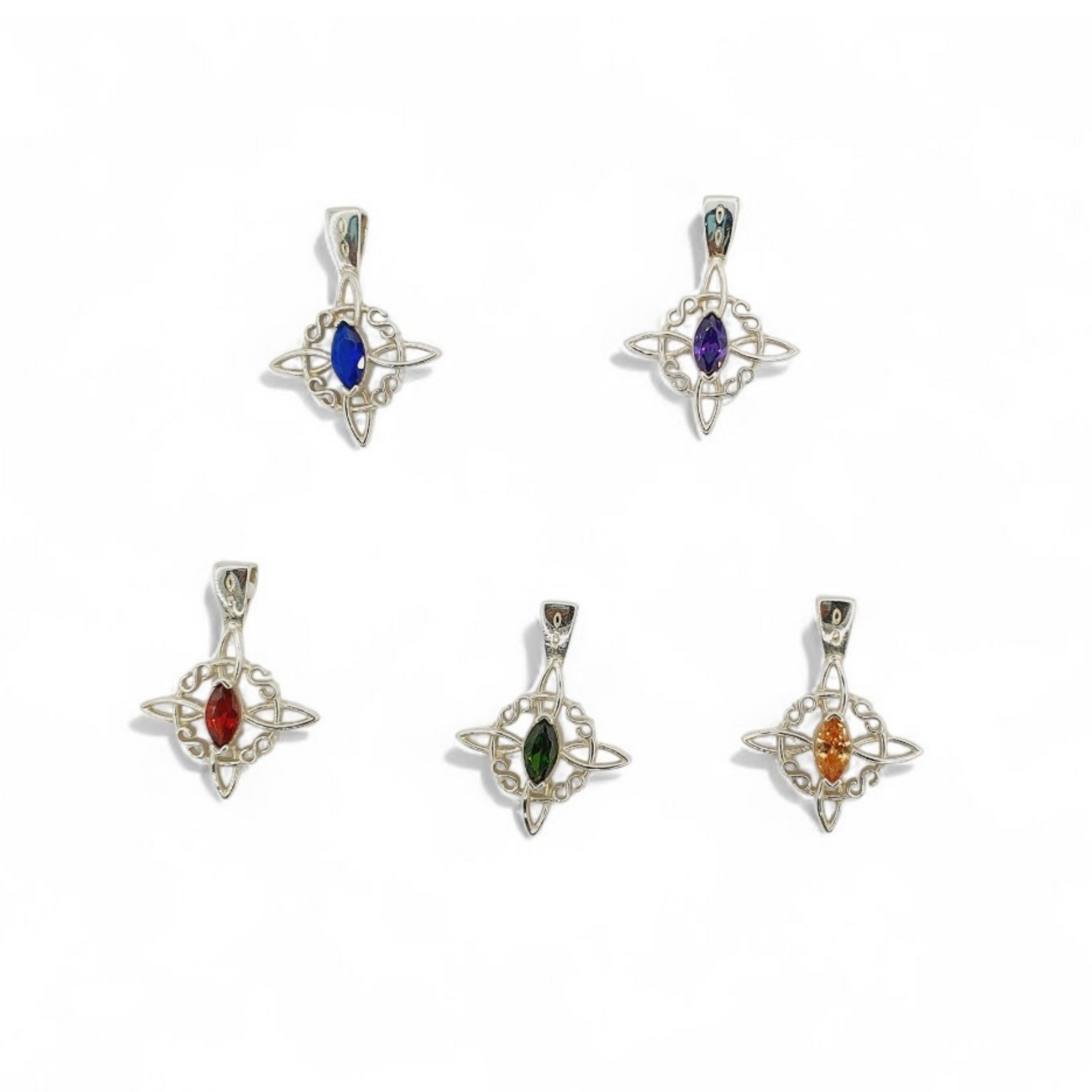 Este elegante dije está elaborado en plata 925 italiana, con un diseño de nudo de bruja que simboliza protección, energía y conexión espiritual. En el centro destaca un brillante circon de color que aporta un toque único y lleno de personalidad.