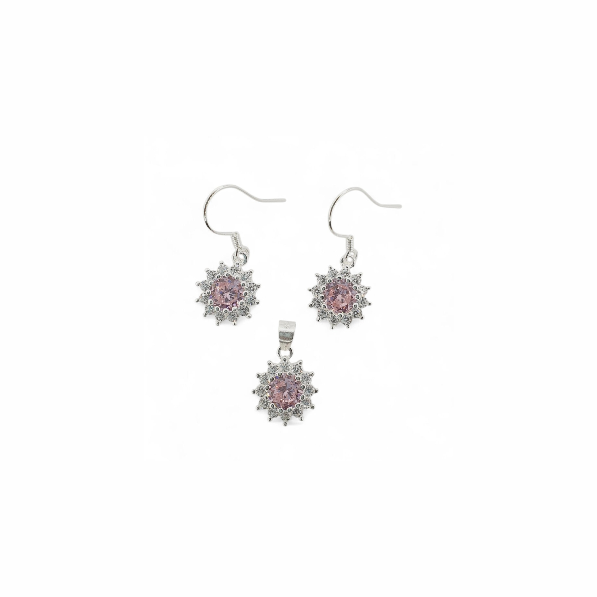 Este diseño tiene un estilo vintage y romántico, inspirado en las flores. El conjunto presenta una piedra central redonda rodeada por una corona de circonias más pequeñas, simulando los pétalos de una flor. Perfecto para ocasiones especiales o para quienes aman lo clásico con un toque de glamour.
