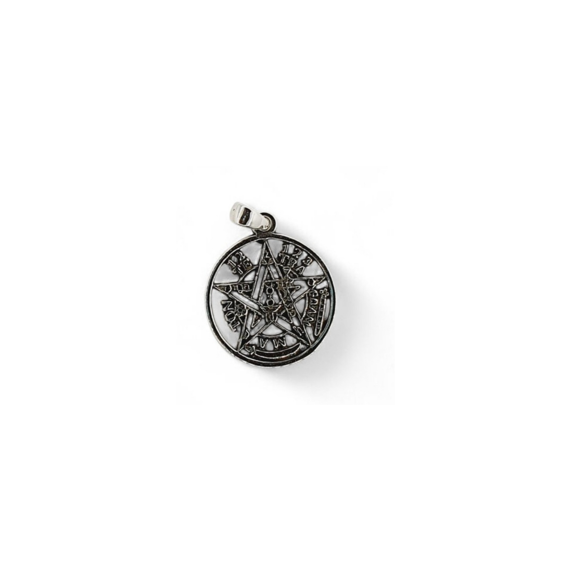 Poderoso dije de plata italiana 925 con pentagrama en relieve. El diseño incluye símbolos y grabados místicos que lo convierten en un amuleto de protección y equilibrio. Perfecto para quienes buscan una joya con significado espiritual y esotérico.